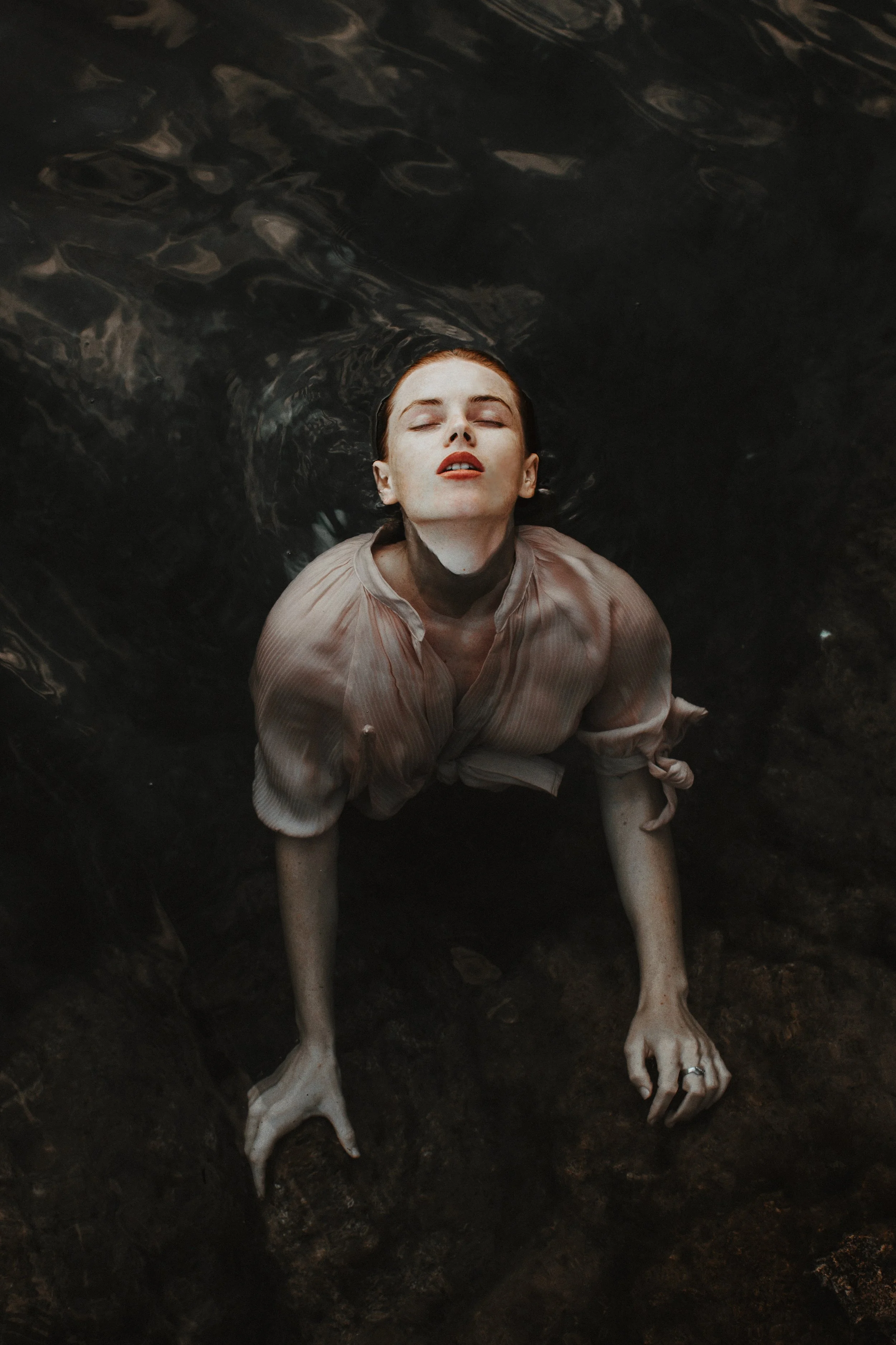 A beautiful young woman discovers her inner peace as she floats her head above crisp clear water. Her eyes are closed in a state of complete calm, while she steadies her hands on some nearby rocks beneath the surface.